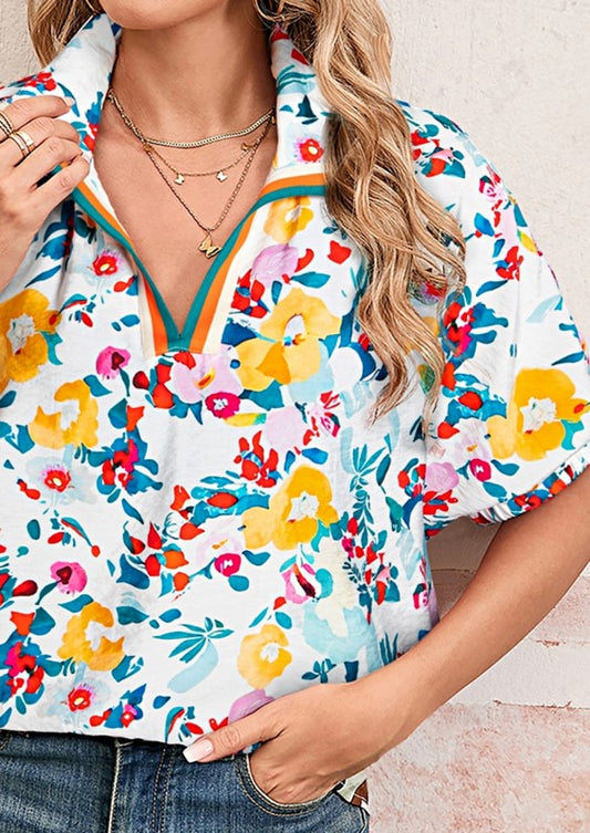 White Floral Puff Sleeve Contrast V Neck Patchwork Blouse