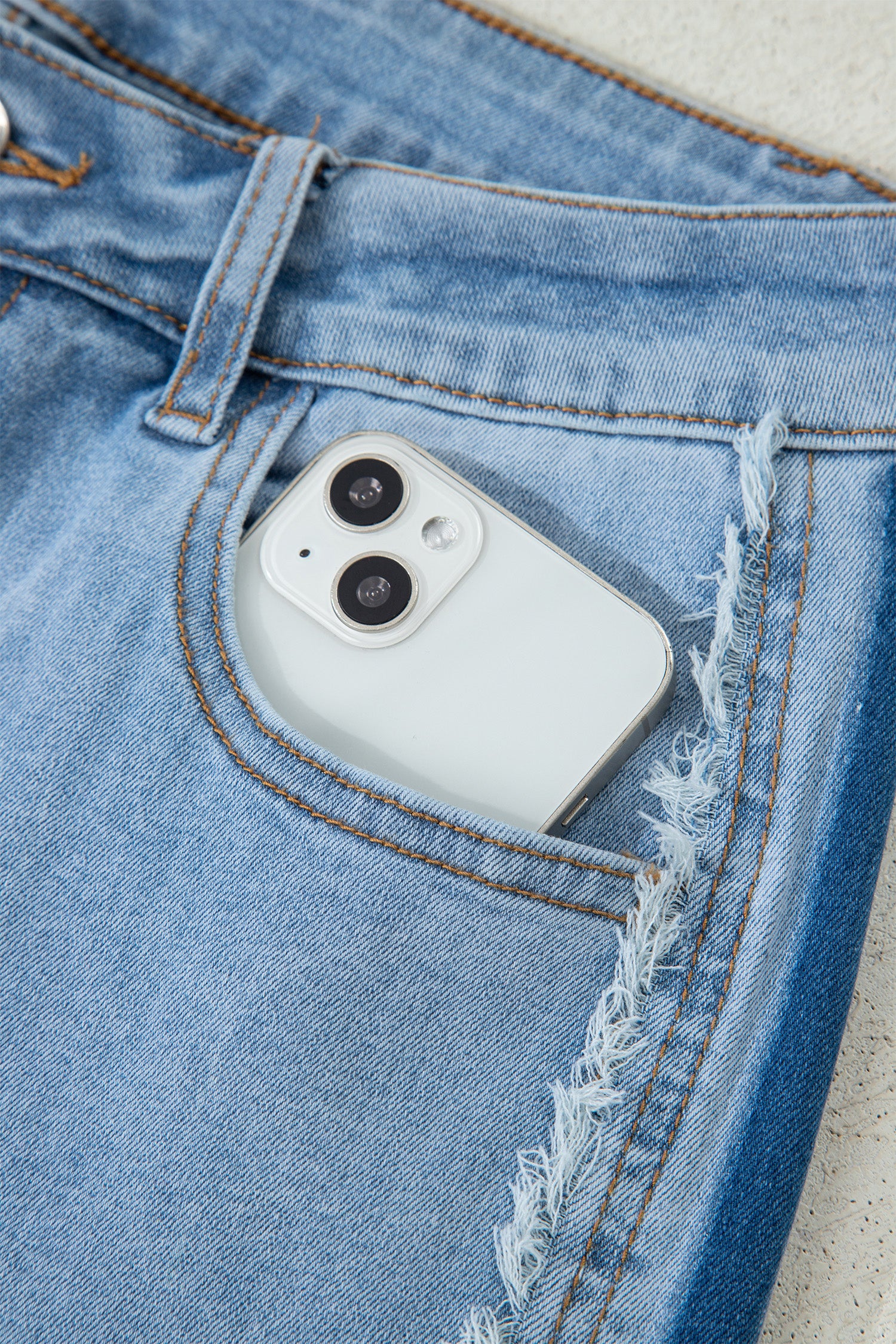 Frayed detailing adds deconstructed texture and urban distressed appeal.