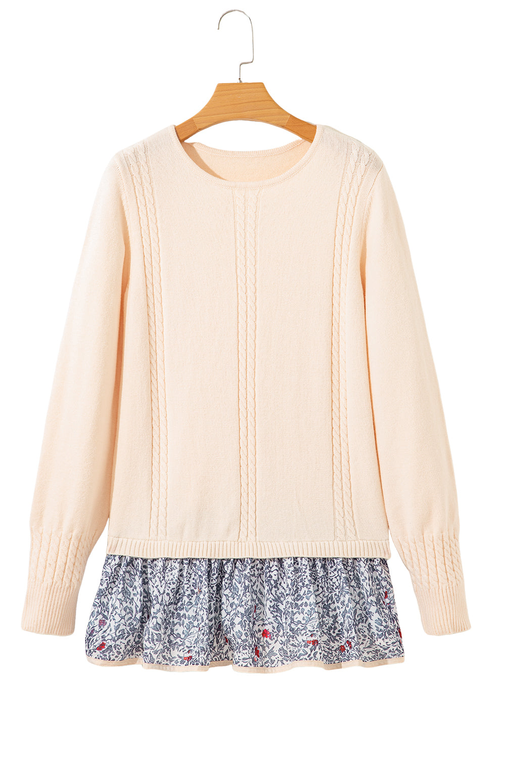 Beige Cable Texture Bohemian Ruffle Hem Patchwork Sweater