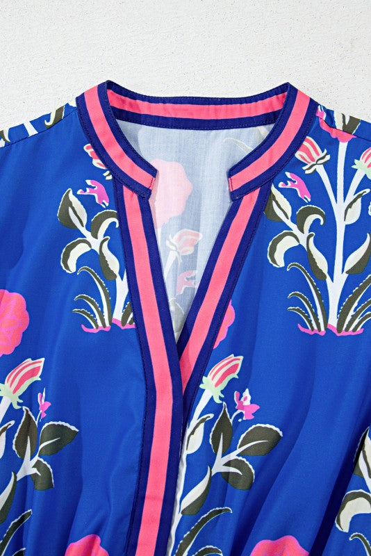 Blue Floral Ruffle Hem Pop of Color Neckline Dress