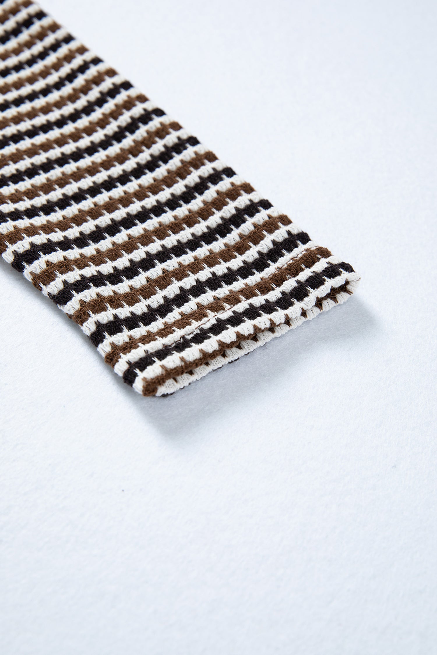 Brown Faux Two Piece Textured Striped Round Neck Long Sleeve T Shirt