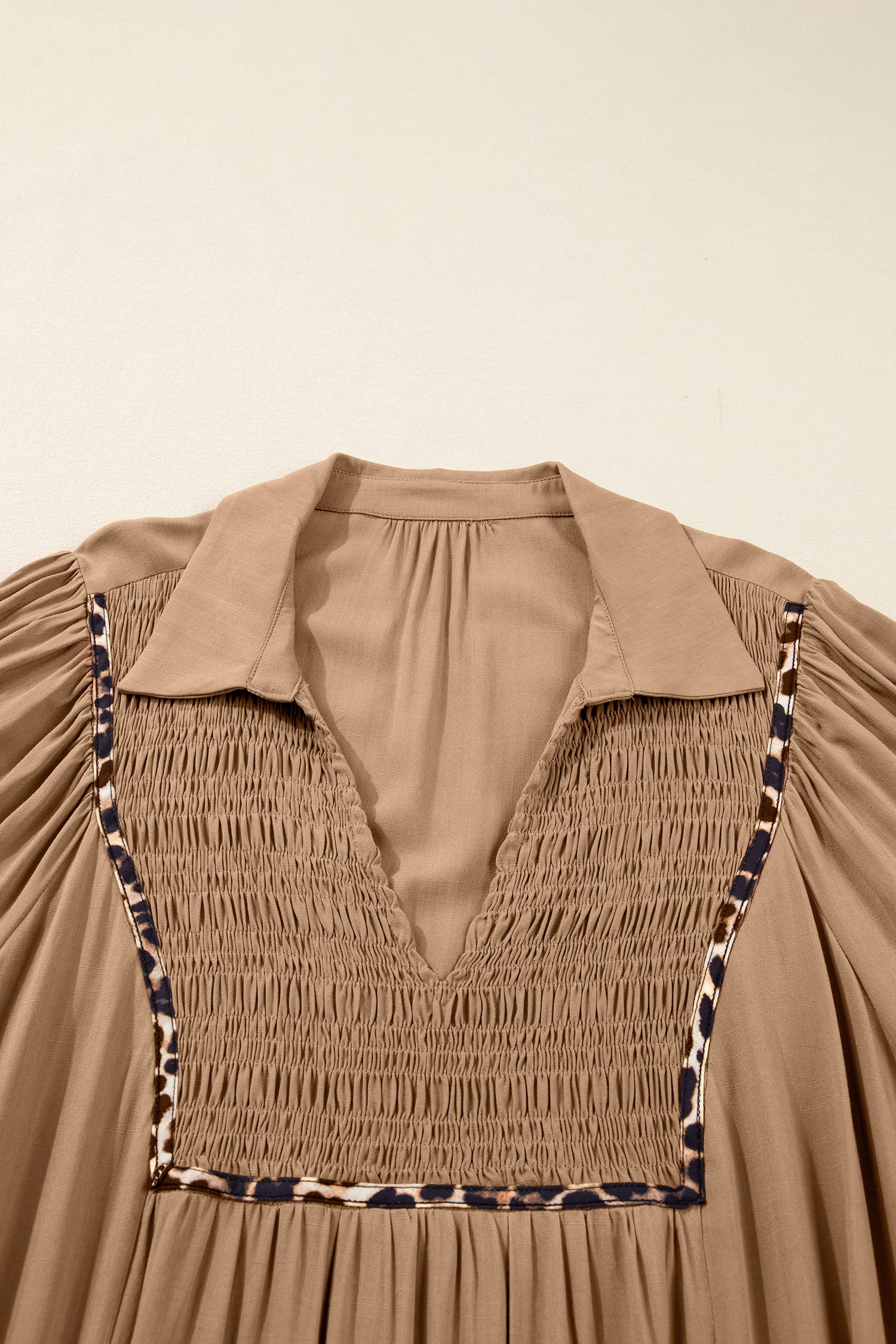 Chestnut Smocked V Neckline Leopard Piping Accent Bracelet Plus Size Long Dress