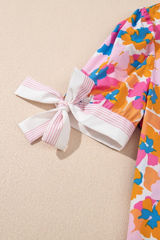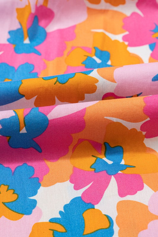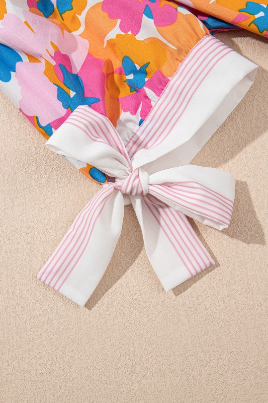 Cotton V Neck Floral Knotted Short Sleeve Blouse