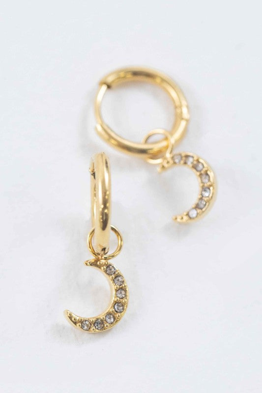 Gold huggie hoop earrings with a dangling crescent moon charm embedded with stones.