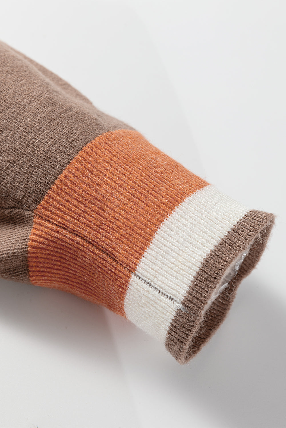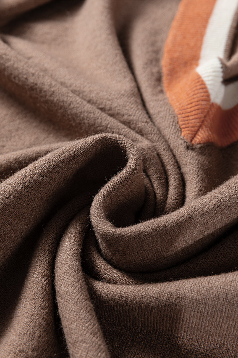 Dark Khaki Contrast Striped Trim V Neck Varsity Sweater
