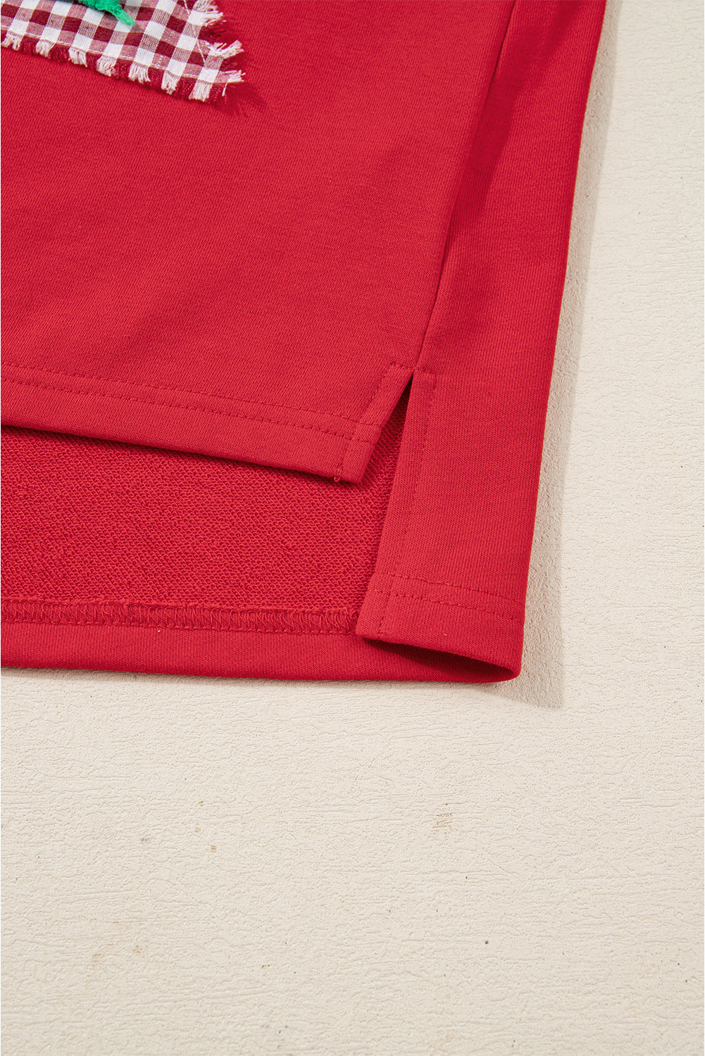 Fiery Red Plaid Frayed Double Christmas Tree Patched Drop Shoulder Sweatshirt
