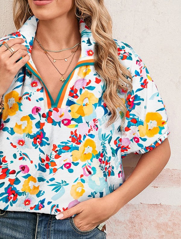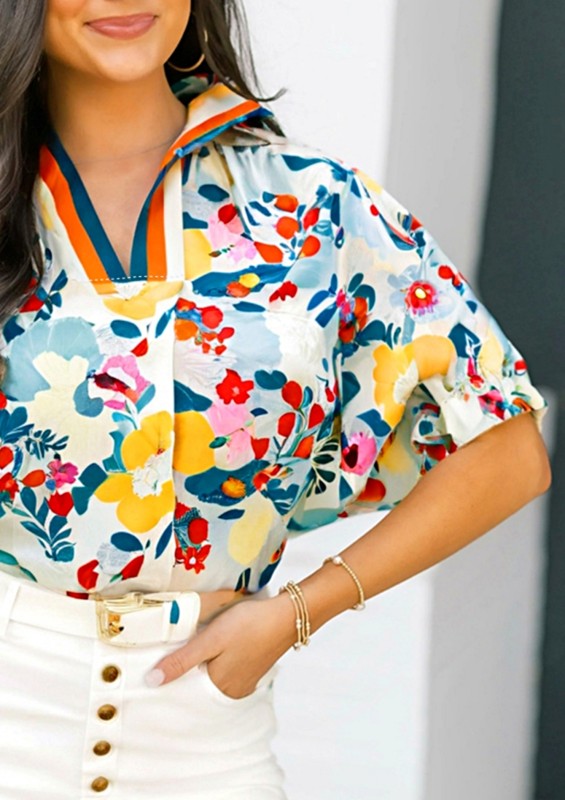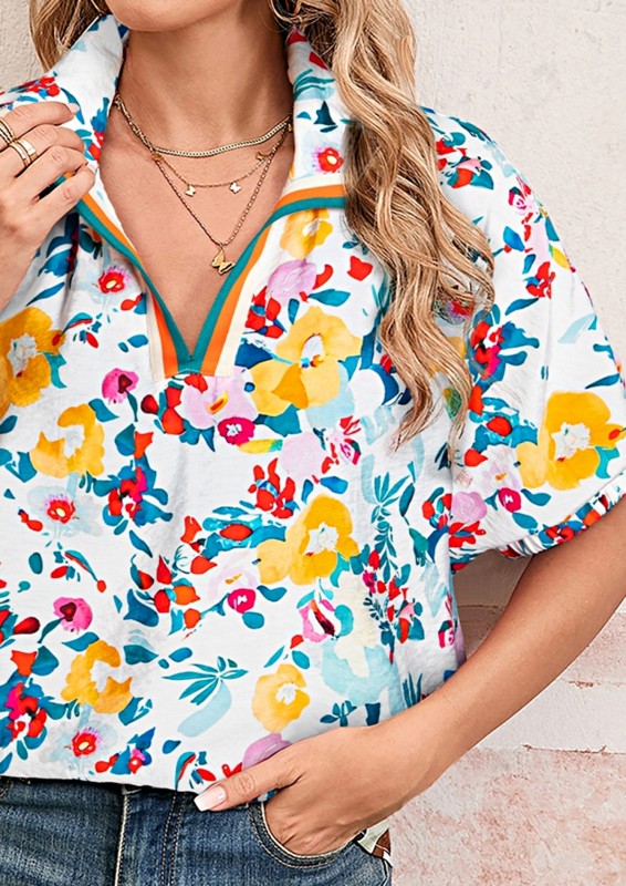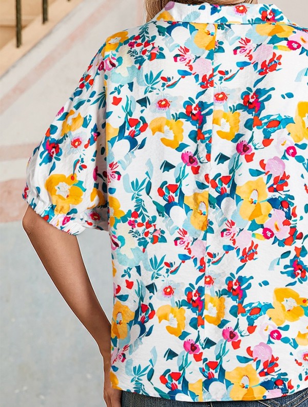 Floral Boho Shirred Bubble Viscose Notch Blouse