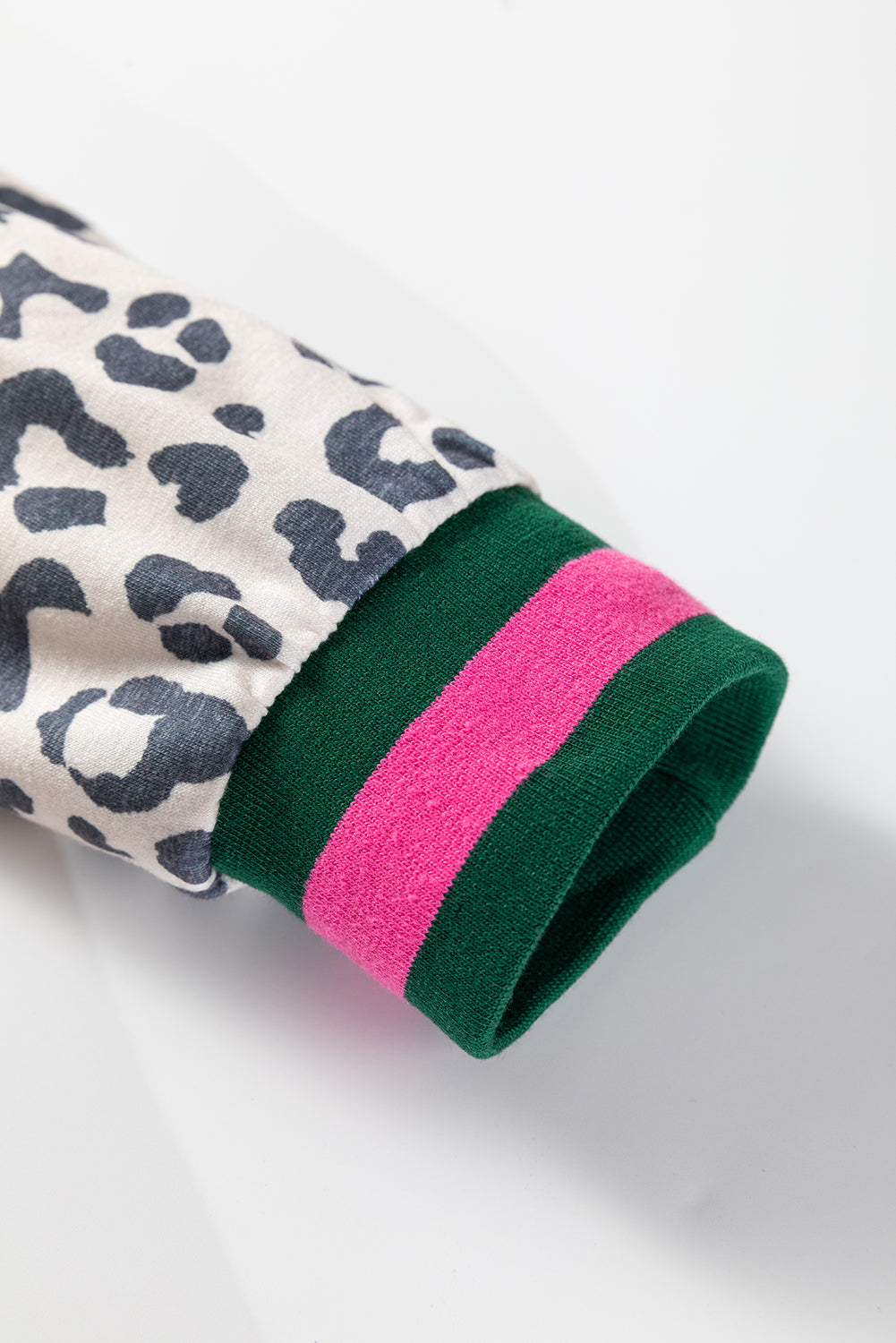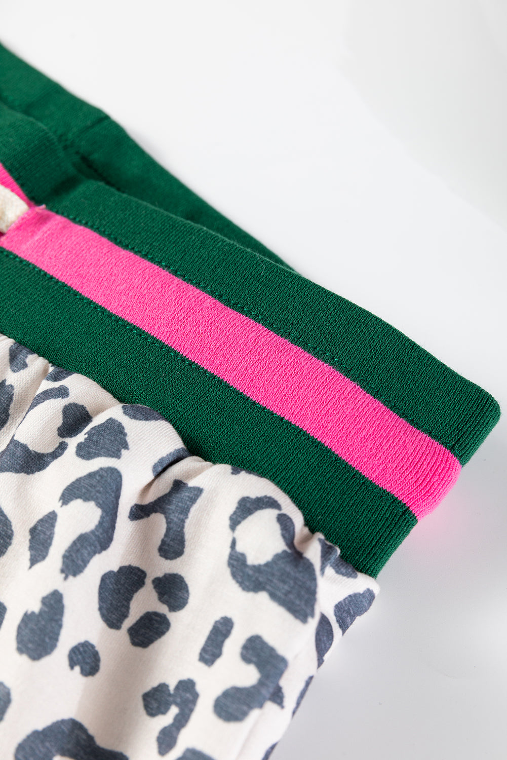 Gray V Neck Leopard Long Sleeve Top Striped Webbing Patchwork Drawstring Pant Set