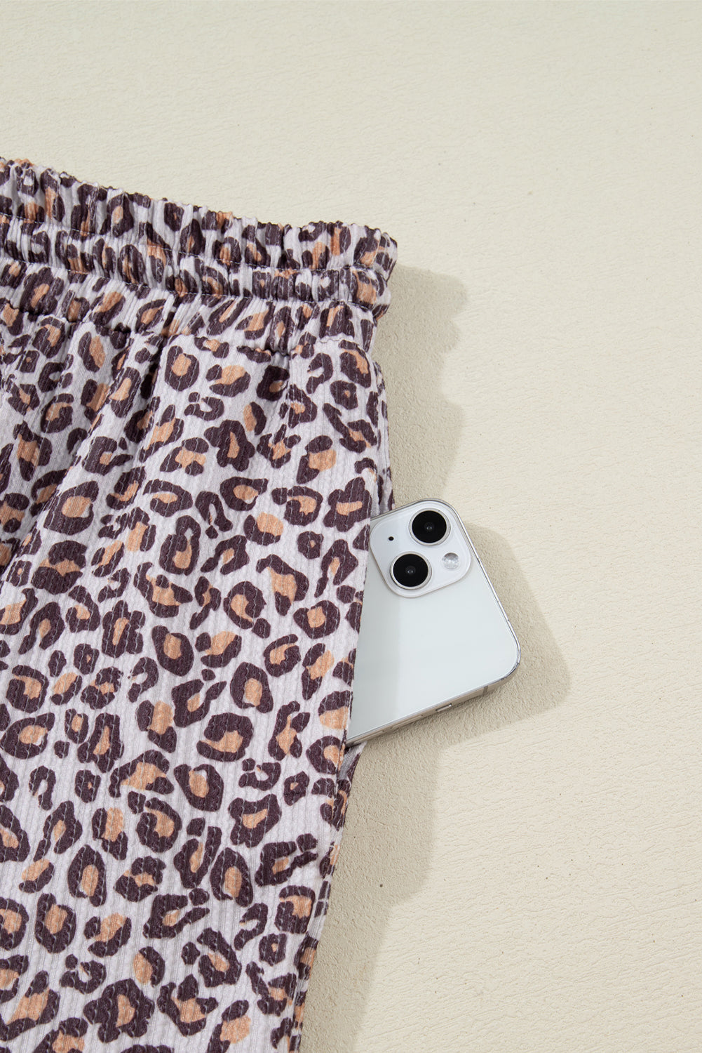 Khaki Leopard Ribbed Long Sleeve Top Drawstring Shorts 2pcs Outfit