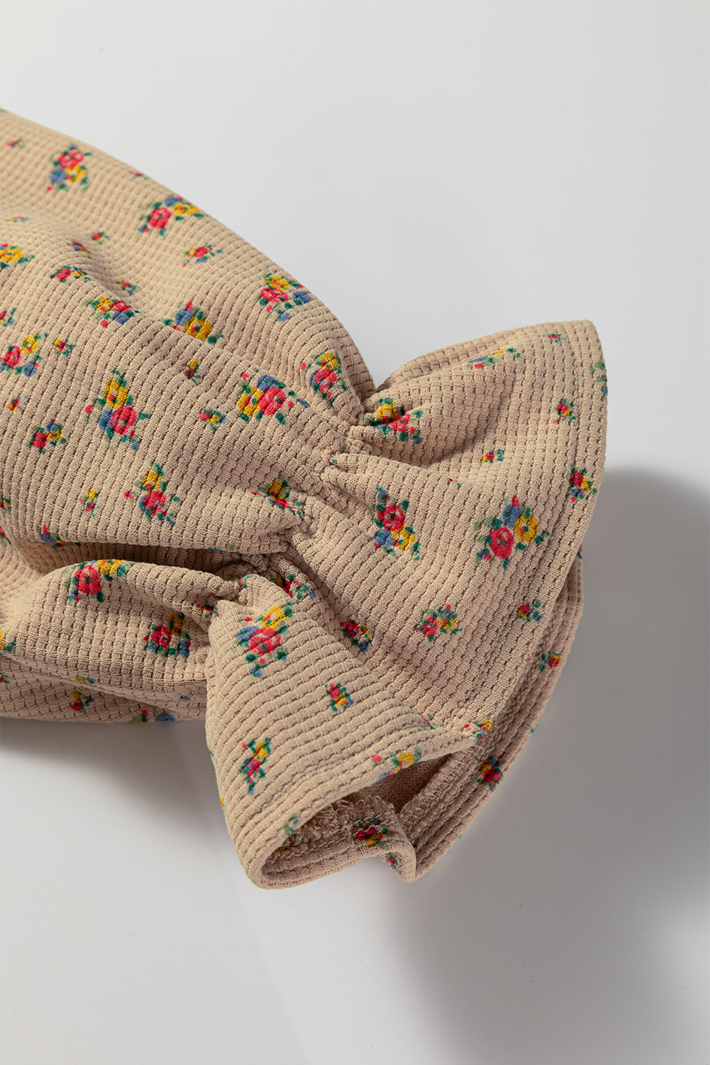 Oatmeal Boho Floral Plaid Patchwork Distressed Detail Ruffled Sleeve Waffle Knit Shacket