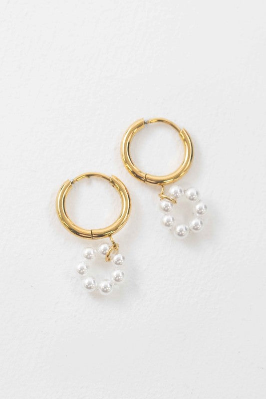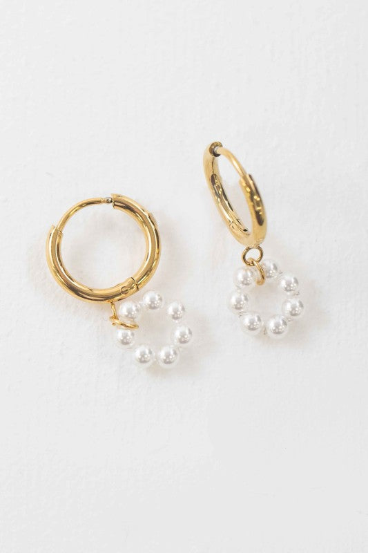 Gold huggie hoop earrings with small pearls threaded to make a dangling circle charm.