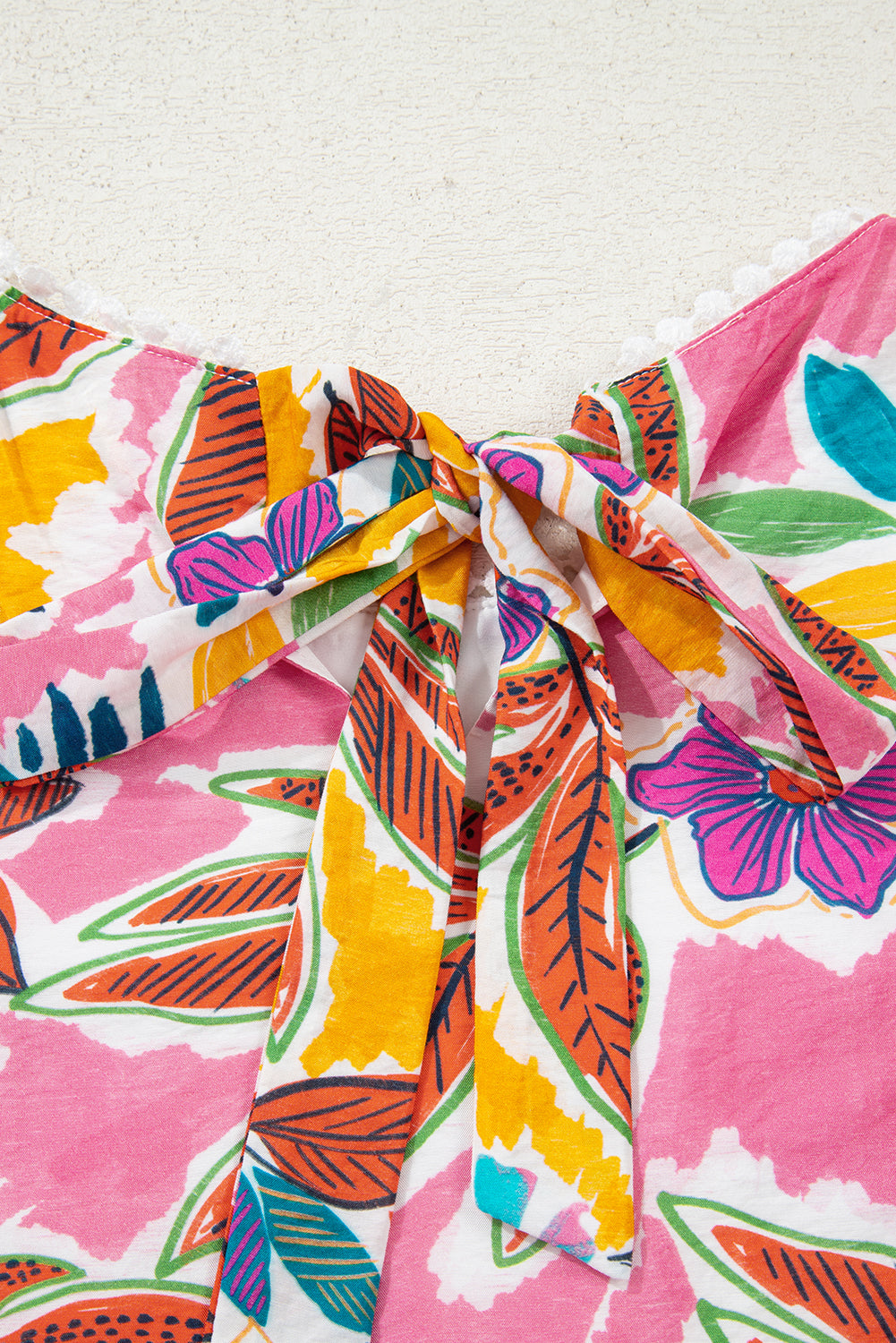 Pink Floral Print Lace Trimmed Tie Back Bell Sleeve Swing Mini Dress