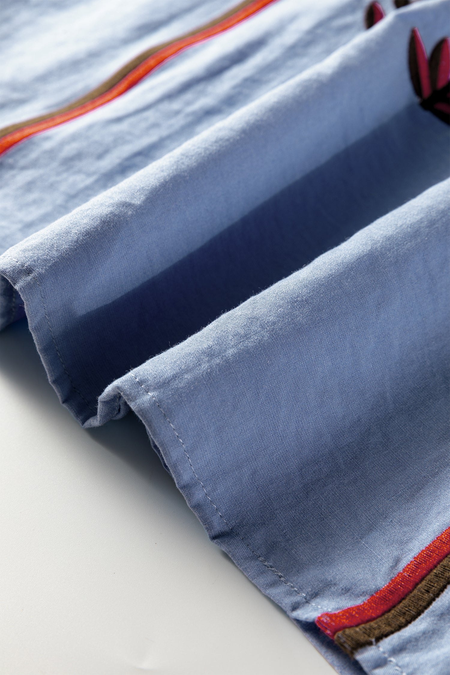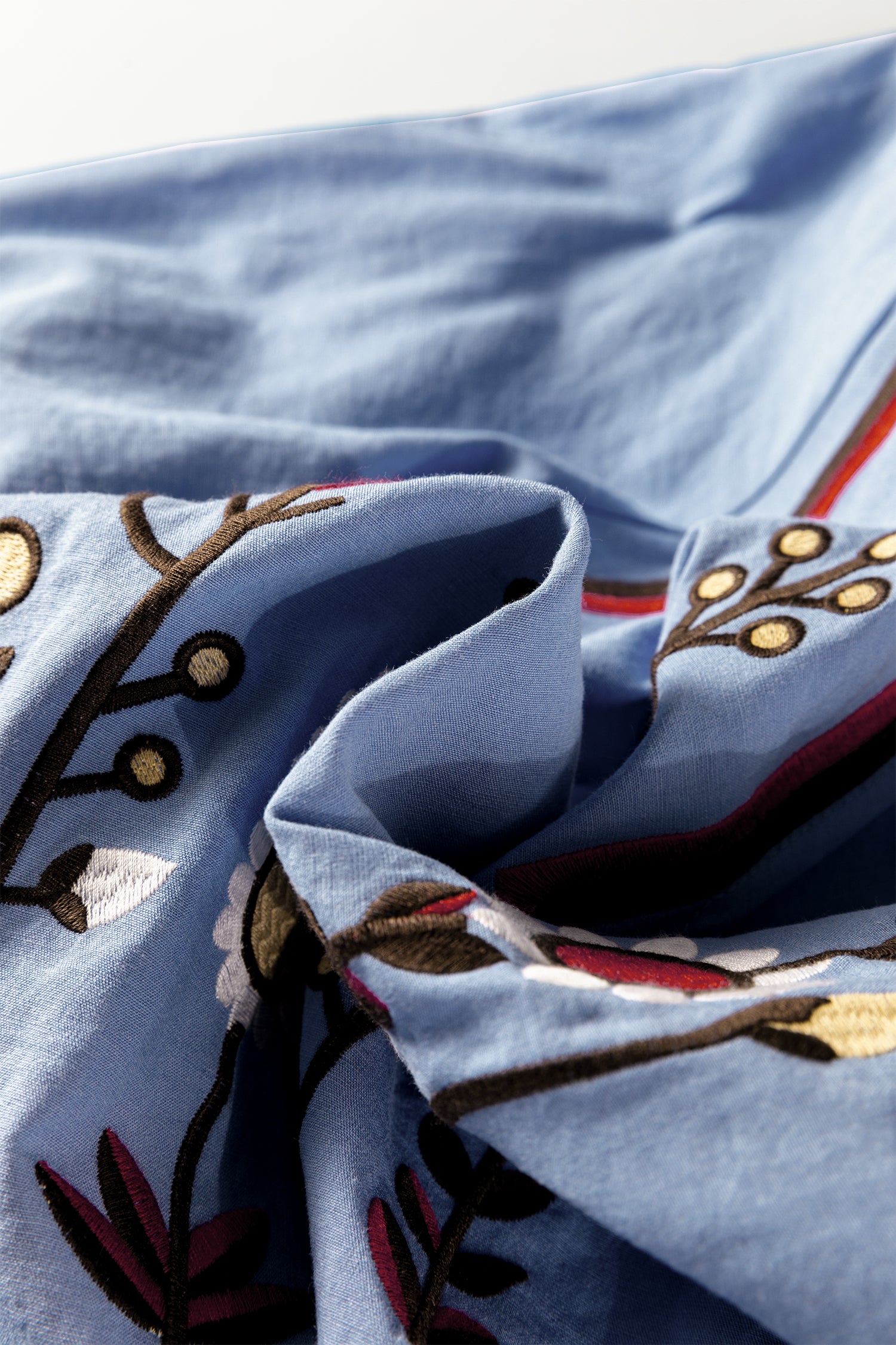 Real Teal Floral Embroidered Split Neck Tassel Tie Puff Sleeve Blouse