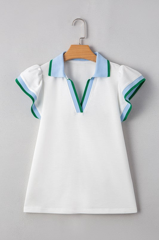 Viscose Collared V Neck Ruffle Sleeve Blouse